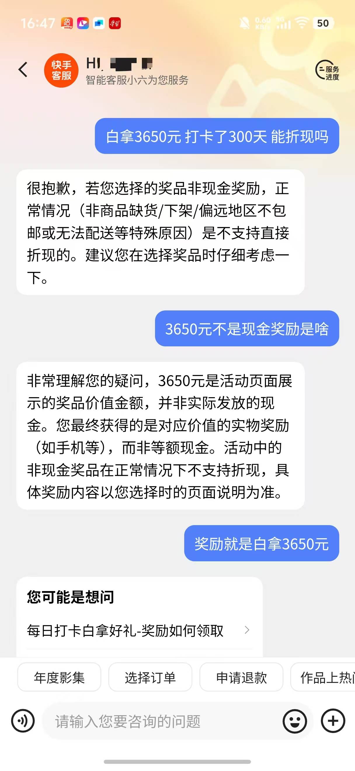 手机不能折现,刘先生“打卡300天白拿好礼现金奖励3650元”,3650元能折现吗?客服说,3650元是活动页面展示的奖品价值金额,而非实际发放的现金,最终获得的是对应价值的实物奖励(如手机等),而非等额现金,所以也不能折现。