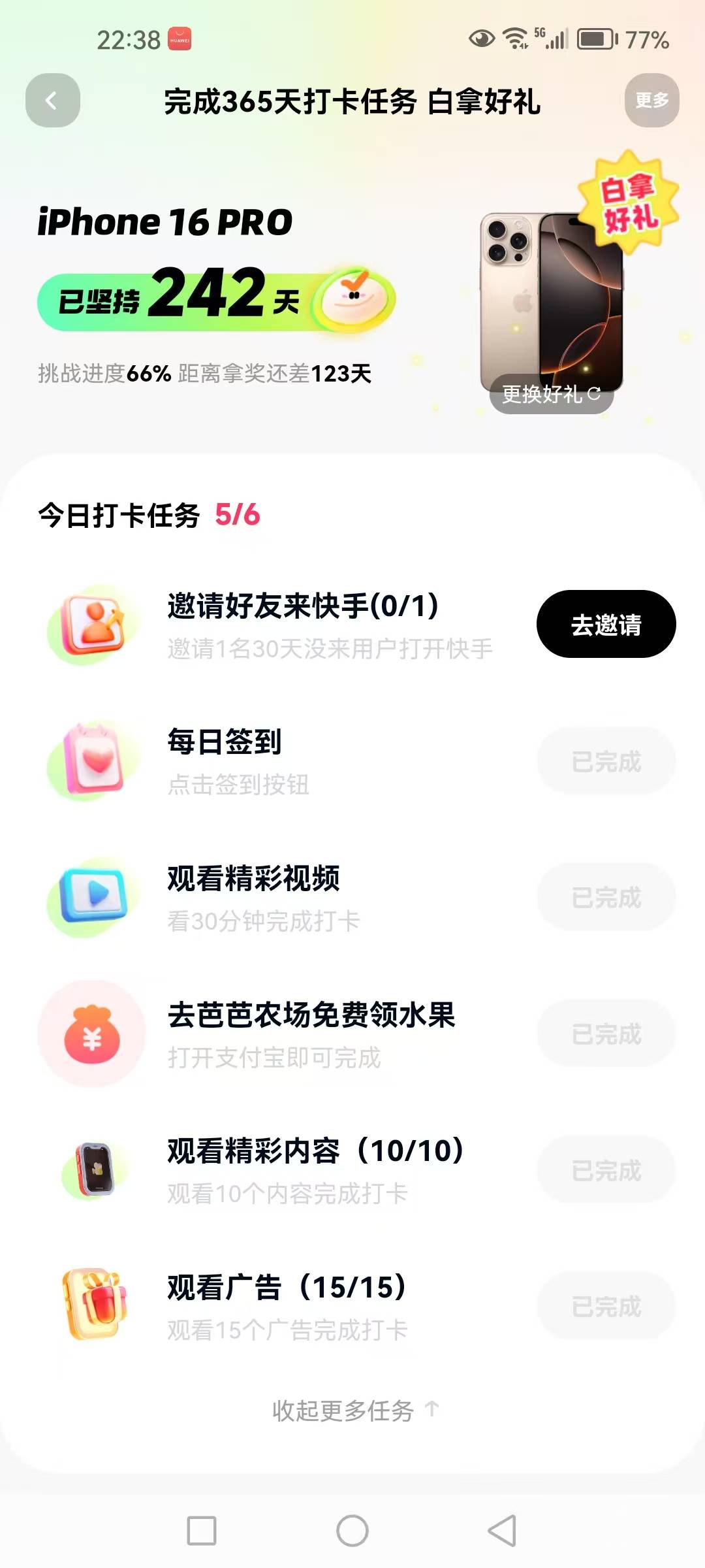在刘先生的活动进度截图上,华商报大风新闻记者看到,活动为“完成365天打卡任务 白拿好礼”。一项为现金奖励3650元,已坚持300天,挑战进度82%距离拿奖还差65天,当天打卡任务完成5/6,未完成的任务为邀请1名30天没来用户打开快手,已完成的任务有每日签到、看45分钟短剧、看30分钟视频、看10个精彩内容、看5个广告等。另一项白拿好礼为iPhone16PRO,未完成任务相同,完成的任务有看30分钟视频、打开支付宝、看10个精彩内容、看15个广告等。