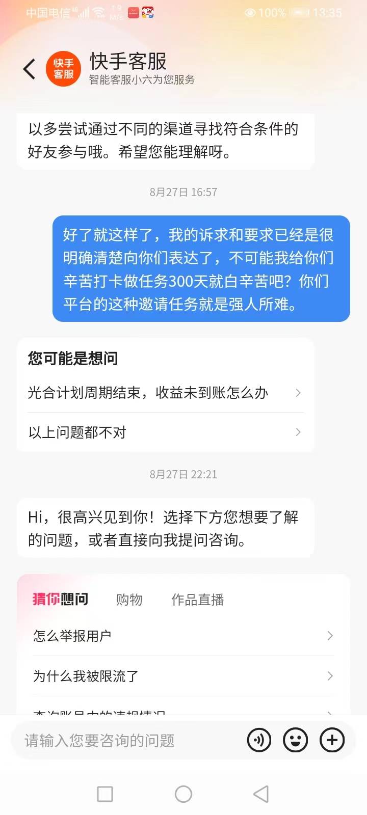 “费时费力的我都能坚持完成,眼看快到365天打卡签到结束了,让我拉人头,还要30天没登录过快手的新用户,我上哪找去?”刘先生说,快手各种不定时、不定量、无底线地不断增加难度,其所谓的“免费”“白拿”是幌子,“夸大其词误导用户,其任务规则的不公平公正,不合理、不透明、含糊坑人。”